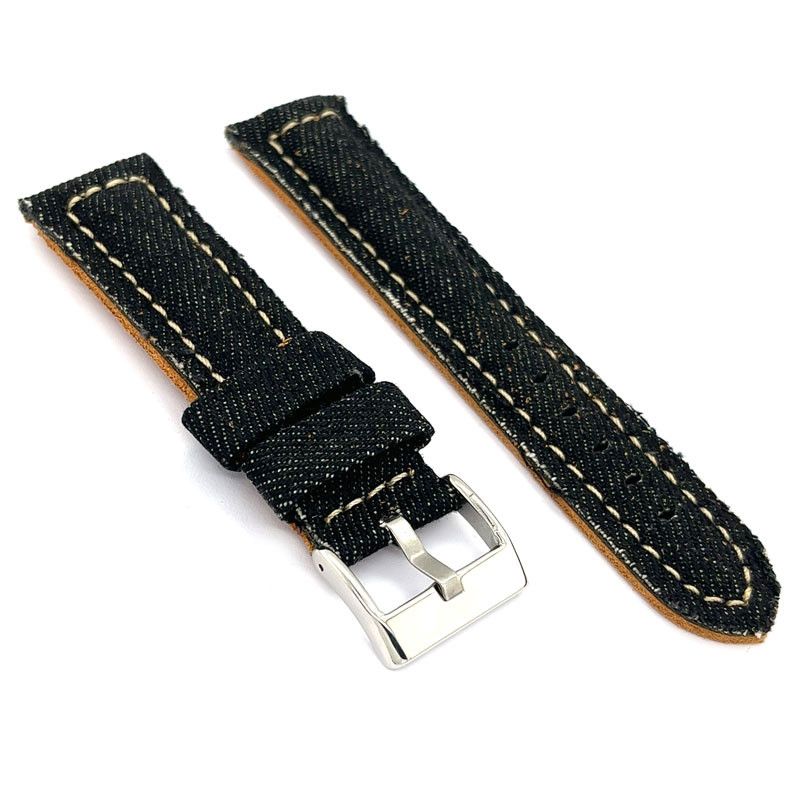 Per la produzione di questi cinturini per orologi utilizziamo tissuto tipo denim. La stessa che si utilizza per i jeans. In piú cerchiamo di dargli anche quell'effetto rovinato, che tanto va di moda nel vestire.